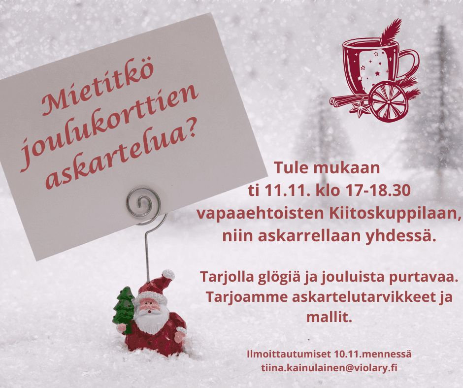 Kokoonnumme jouluiseen Kiitoskuppilaan joulukorttiaskartelun merkeissä. Tarjolla on glögiä ja jouluista purtavaa. Tarjoamme askarteluun materiaalit ja mallit.
