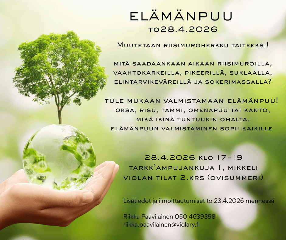 Mitä saadaankaan aikaan riisimuroilla, vaahtokarkeilla, pikeerillä, suklaalla, elintarvikeväreillä ja sokerimassalla? Tule mukaan valmistamaan elämänpuu! Oksa, risu, tammi, omenapuu tai kanto, mikä ikinä tuntuukin omalta. Elämänpuun valmistaminen sopii kaikille.