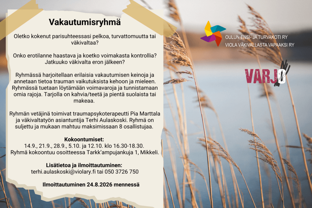 Ryhmässä harjoitellaan erilaisia vakautumisen keinoja ja annetaan tietoa trauman vaikutuksista kehoon ja mieleen. Ryhmässä tuetaan löytämään voimavaroja ja tunnistamaan omia rajoja. Tarjolla on kahvia/teetä ja pientä suolaista tai makeaa.
