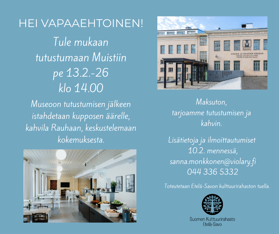 Tervetuloa tutustumaan Sodan ja rauhan keskus Muistiin. Tutustumiskierroksen jälkeen istahdetaan hetkeksi Kahvila Rauhaan keskustelemaan kokemuksesta ja suunnittelemaan seuraavia yhteisiä tapahtumia. Tarjoamme tutustumisen ja kahvit. Ilmoittaudu mukaan!