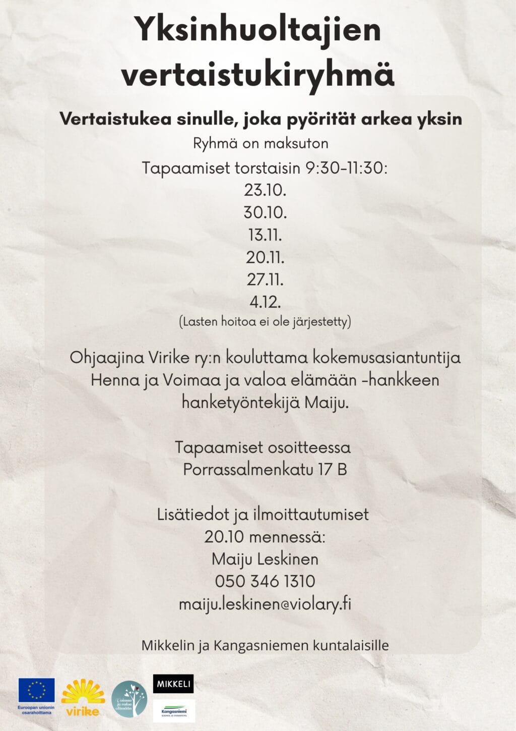 Ryhmä on Mikkelin ja Kangasniemen kuntalaisille ja se on maksuton.