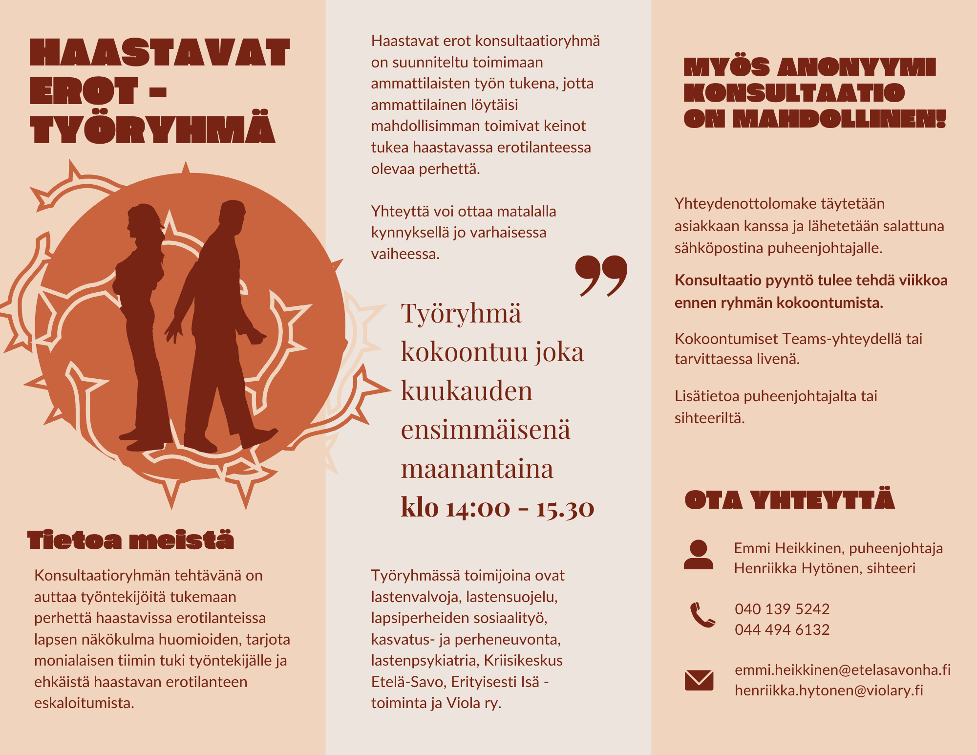 Konsultaatioon saat Teams-kutsun viimeistään ajanvarausta edeltävänä päivänä. Voit ottaa työntekijöihimme yhteyttä myös sähköpostitse tai soittamalla numeroon 010 337 8650. Meidät tavoittaa parhaiten puhelinaikoina: tiistaisin klo 10-11, keskiviikkoisin ja torstaisin klo 12-13. (Huomioithan, että loma-aikojen sulku- ja poikkeusajat ilmoitamme Ajankohtaista-sivulla.)